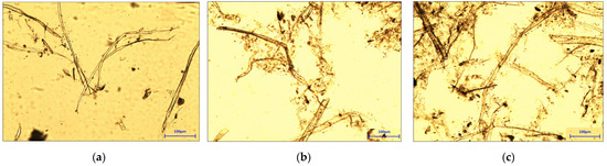 In contrast, the use of the ultra-fine bar plate in Figure 7c yields a different fiber morphology. The resulting fibers largely retain their original length and structure, with fewer short fibers and fines produced. Fibrillation is present but more uniform and less pronounced. The overall structure is coherent with fewer visible debris particles, reflecting the more controlled action of the ultra-fine bar plate. These differences highlight the important role of plate selection in controlling fiber breakdown, fines generation, and network uniformity [5,10,11].