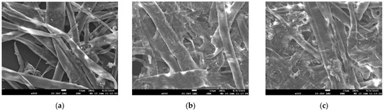 Figure 8 shows the corresponding differences in sheet structure as observed by SEM. Sheets formed from disintegrated fibers (Figure 8a) reveal loosely bound networks with smooth fiber surfaces and limited bonding. When fibers refined at CEL 37 km/s are used (Figure 8b), the resulting sheet displays a denser and more compact network, characterized by abundant fines that fill void spaces and improved interfiber bonding, though often at the expense of drainage and formation due to the excessive presence of fines. Sheets derived from fibers refined at CEL 97 km/s (Figure 8c) show a well-developed network structure with strong bonding and relatively fewer fines. The sheet retains an open yet interconnected architecture, consistent with the more moderate morphological changes induced under these conditions.