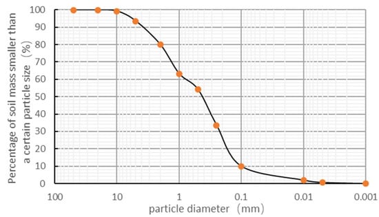 The experimental setup was designed to simulate various landslide conditions and monitor the corresponding self-potential (SP) signals. The physical model consisted of a U-shaped soil container with dimensions of 15 cm × 15 cm × 35 cm, filled with slope alluvial soil. The soil used in the experiments was collected from a typical slope alluvial area, and its particle size distribution is shown in Figure 1. The container was equipped with transparent acrylic walls to allow visual observation of the soil conditions during the experiments.