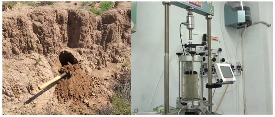 The location of the soil-sampling site (39.9° N, 118.3° E) is shown in Figure 2. Prior to the test, direct-shear measurements under consolidated-undrained (CU) conditions yielded the following average mechanical properties: cohesion c = 18.4 ± 1.2 kPa, internal friction angle φ = 26.7 ± 0.8°, and bulk unit weight γ = 19.5 kN m−3 (3 replicates). The soil profile photograph is shown in Figure 3.