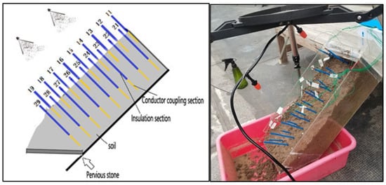 The soil container was fitted with one layer of permeable stones at the bottom to act as filters and prevent soil erosion. Copper electrodes were embedded in the soil at a spacing of 3 cm along the centerline of the container. The electrodes were partially insulated with electrical tape to facilitate adjustment of the signal collection depth. The experimental setup is illustrated in Figure 4.