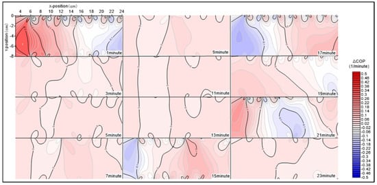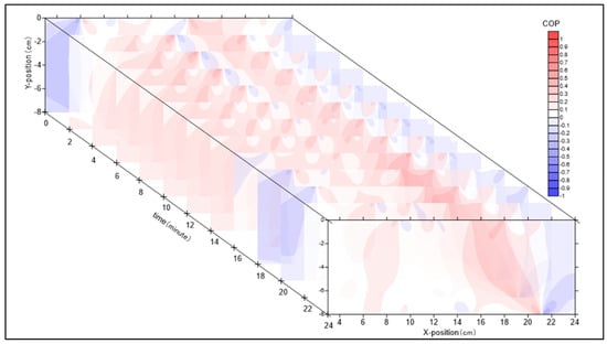 Figure 5 shows the COP tomography profile of SP at each time. It can be observed that the COP is capable of more lucidly reflecting the relationship between the heterogeneous points, as described previously. There is a structural plane between surface electrode 14 (X-position 9 cm) and the bottom electrode 22 (X-position 6 cm), and the charge is accumulated. There is a structural plane between surface electrodes 16 and 17 (X-position 15–18 cm) and the bottom electrode 28 (X-position 21 cm), which accumulates charge. By interpolating the COP at adjacent moments and dividing it by the time interval, the COP growth rate information is recorded as ΔCOP, as shown in Figure 6. ΔCOP has a sensitive recognition effect on the dynamic evolution of seepage flow and creep start-up in slope.