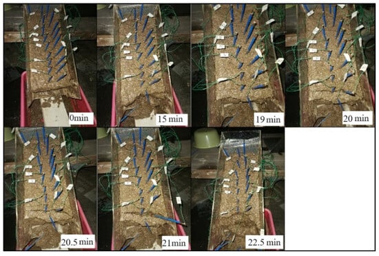 At the beginning, rainfall increases saturation and seepage, and the infiltration rate is fast, which corresponds to the rapid growth in COP at the top of the slope, and then, the COP of the whole slope maintains a slow growth, which corresponds to the decrease in rainfall infiltration rate after surface flow production. At the 15th min, the COP suddenly shows negative growth at the top of the slope, and the growth rate of the middle and lower part of the slope suddenly accelerates, which corresponds to the start of creep. After creep begins, the compressive pore pressure at the lower part of the slope is larger, and the tensile pore pressure at the top of the slope decreases, which corresponds to the negative COP growth at the top of the slope at 15–17 min. The COP growth at the bottom of the slope is accelerated, and the COP in the middle of the slope shows negative growth at 21 min, which corresponds to the greatly weakened seepage flow in the middle of the slope, with the discharge of water in the slope after creep stops, and the pore pressure decreases. The process of slope splitting is shown in Figure 7.