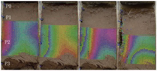 In order to study the relationship between slip displacement and SP signal, a timing camera was added on the basis of the above experimental device. By adjusting the camera stand, the camera lens shooting angle was parallel to the slope, and the focus center was at the center of the broken surface. The white balance of the shot was set to automatic, with one frame shot every 3 s. The displacement parameters were obtained using digital image correlation (DIC) technology [30], which draws surface displacement information by comparing the pixel differences of matching features between two frames of images [31,32]. The experiment adopted the PolymerGuy-programmed muDICV2.1.0, which is an open-source software available on Github [33]. The principle of DIC processing is to analyze and compare the regions of interest of the two images before and after and to record the difference between the position with the strongest correlation between each local region in the region of interest and the original position as the displacement of each local point. In this experiment, the analysis area of interest in the image was first set, and then, the average value of all local displacements was taken and saved in the file, so as to record the mean value of the overall displacement of each frame. The initial unit of displacement calculation was pixel (px). In this experiment, the length of the soil tank was 350 mm, and the height of the image pixel was 660 px. Therefore, the conversion ratio was 1 px = 0.53 mm. The displacement of each local point was distinguished by color. The DIC displacement field of the slope in the partial period is shown in Figure 8.