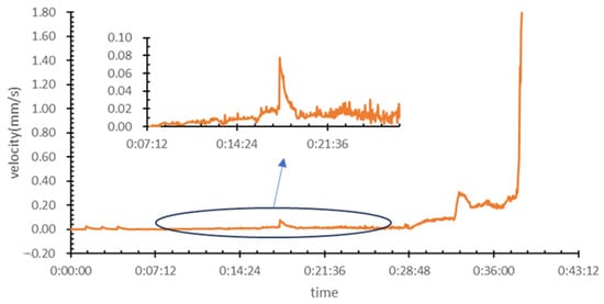 The displacement curve has the characteristics of the Saito model [25] (Figure 9). Figure 10 shows the velocity curve as the derivative of displacement with respect to time. For the first time, the velocity changed dramatically at 18:19, from below 0.01 mm/s to above 0.01 mm/s, which corresponded to the transition from uniform deformation to initial acceleration. A third sudden change in velocity occurred around 29:02, and the velocity continued to increase after the overall increase jump, which corresponded to the transition from the initial acceleration stage to the middle acceleration stage. The velocity changed for the third time at 32:49, from the overall level of 0.06 mm/s to the level of 0.15 mm/s, which corresponded to the transition from the intermediate acceleration stage to the acceleration stage of the slope. The last abrupt change in speed occurred near 38:14, corresponding to the final stage of slope failure.