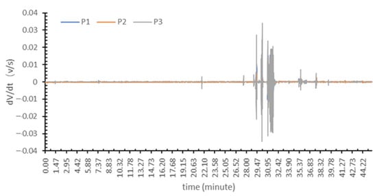 The sliding t-test was applied to the SP data to detect significant changes in the mean value of the signals over time (Figure 11). By comparing the mean values of consecutive signal segments, the sliding t-test identified abrupt changes in the SP signals that could be associated with the initiation of landslide movement. The results showed that the sliding t-test was effective in detecting early-warning signals, with a high sensitivity to changes in the SP data.