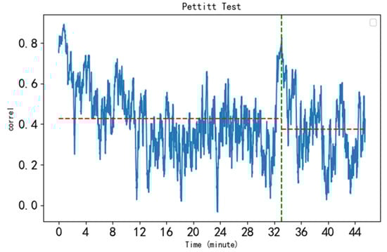If P ≤ 0.05, the mutation point was considered statistically significant. The Pettitt test was carried out on the correlation coefficient. As shown in Figure 14, the mutation point was 33.1 min, and the corresponding p value was 1.99, which was evaluated as insignificant change. It can be considered that the significance of this mutation lies more in identifying the transformation of SP from random change to consistent change, and the randomness of SP change is related to the moisture content and heterogeneity of soil mass. When the water content is low and the heterogeneity is high, the randomness of SP change will increase; otherwise, the consistency of SP change will increase, and the soil water content at this time will be basically stable. The source of randomness is mainly the influence of the instantaneous soil structure change on the heterogeneity; therefore, the mutation significance is not high.