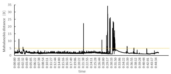 It is known that the Mahalanobis distance in Figure 15 is derived from the SP data of the three electrodes and conforms to the χ2 distribution with three degrees of freedom. By looking up the χ2 distribution, it can be found that the cumulative probability of D = 3 is 97.1%, and the cumulative probability of 5 is 99.9%. Therefore, the state with a Mahalanobis distance of 5 can represent a 99.9% probability of a sudden mutation anomaly. A comparison with Figure 8 reveals that the abnormal moments all correspond to abnormal acceleration situations. Even the slight acceleration in the initial period from 1:16 to 2:32 is strengthened and magnified in the Mahalanobis distance of SP.