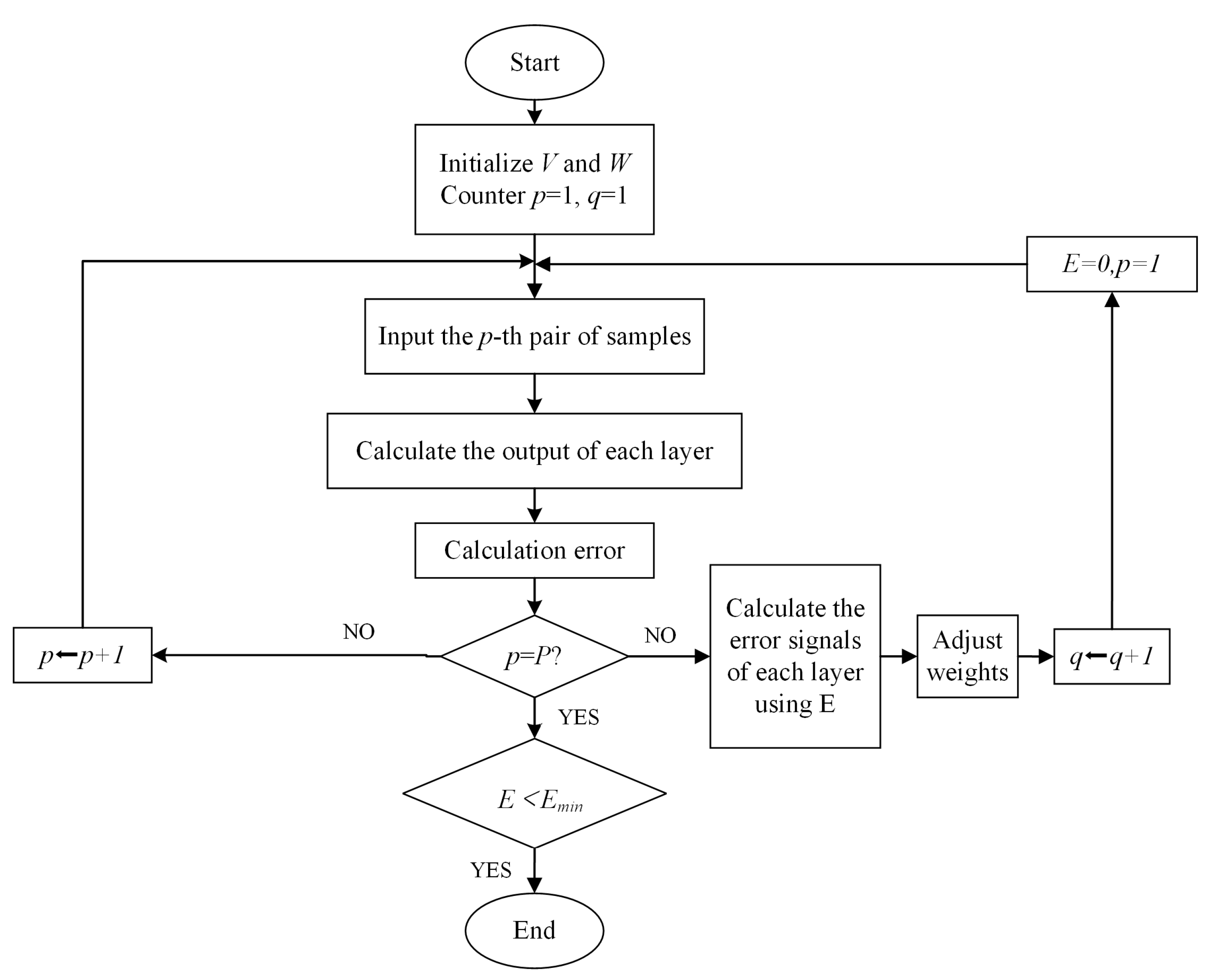 Based on Equation (23), it is evident that the network error depends on the weights w j k and v i j associated with each layer, indicating that modifying these weights can alter the magnitude of the error E . The calculation concludes when E is less than or equal to e or when the specified number of learning iterations has been completed. If neither condition is satisfied, backpropagation will be utilized for further calculations.