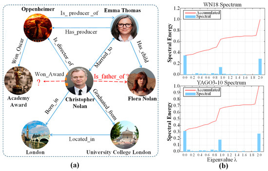 Figure 1. (a) An example of KGs, showcasing their extensive collection of entities and relations. The two red dashed lines represent two distinct link prediction tasks within KGR: One focused on predicting relations, such as (Christopher Nolan, ?, Flora Nolan), and the other on predicting entities, exemplified by (Christopher Nolan, Won_Award, ?). (b) The energy distribution of the graph links between WN18 and YAGO3-10.