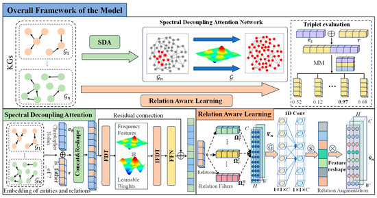 As shown in Figure 2, the proposed RASD comprises three key components: spectral decoupling attention network (SDA), relation-aware learning (RAL), and link scoring. SDA first employs the fast Fourier transform (FFT) to project joint embeddings of entity and relation into the spectral domain, and then adaptively allocates attention across different frequency components, which enables comprehensive extraction of fine-grained interactions within high-frequency components while selectively focusing on a small set of critical spectral bands, thereby achieving efficient global reasoning. Then, RAL applies relation-aware filters and an augmentation mechanism to preserve the intrinsic semantic features of each relation and suppress irrelevant signals, facilitating fine-grained modeling of heterogeneous relation properties. Finally, the link scoring module evaluates predicted triples by computing similarity scores between transformed representations and all candidate tail entities.