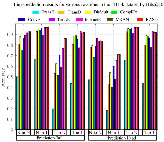 Table 7 and Figure 3 report the link prediction performance of the RASD framework on the FB15k and WN18 datasets when modeling complex heterogeneous relations. Figure 3 examines four relation patterns in FB15k (1-to-1, 1-to-N, N-to-1, and N-to-N), evaluating both tail- and head-entity prediction using Hits@10, thereby alleviating path-dependence effects inherent in FB15k. Against eight competing approaches, RASD achieves the highest Hits@10 in three of the four categories for tail-entity prediction and demonstrates highly competitive performance on head-entity prediction.