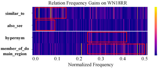 Spectral visualization of relation heterogeneity. Figure 7 presents relation-level average frequency-domain gain heatmaps for the WN18RR dataset. Each row corresponds to a relation; similar_to and also_see are symmetric relations, whereas hypernym and member_of_domain_region are asymmetric relations. Color intensity denotes the average amplification factor assigned by SDA at each frequency band, with brighter colors indicating stronger weighting of the corresponding spectral component. The results reveal a consistent spectral pattern: symmetric relations exhibit pronounced gains in low-frequency components, which indicates smoother and more globally consistent vector representations; asymmetric relations show stronger responses in mid-to-high frequency components, which indicates representations with greater local variation or directional features. These observations suggest that spectral decoupling separates interaction patterns across semantic scales in feature space and that SDA assigns differentiated frequency-band weights to different relation types, thereby improving link prediction performance.