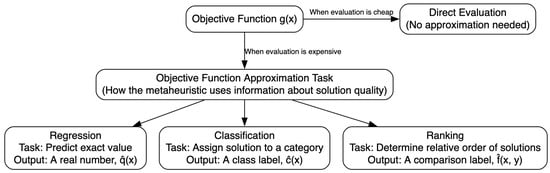 A straightforward formalization of the quality measure is to define the objective function that evaluates the points from the search space. The search is aimed at finding the global minimum of the objective function, i.e., to find points that satisfy the condition . While a single objective function g(x) provides a direct quality measure, in cases when its computational cost is high, it can be approximated. This approximation can take three fundamental forms—regression, classification, or ranking—as visually summarized in Figure 1.