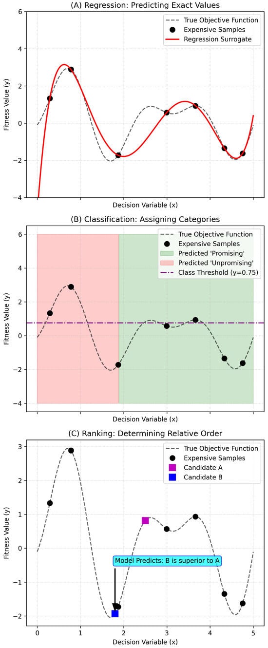 An illustrative comparison of the three core surrogate model tasks. (A) A regression model attempts to approximate the true function’s continuous values. (B) A classification model divides the search space into discrete categories, such as “Promising” and “Unpromising”. (C) A ranking model is used to determine the relative superiority between two candidate solutions.