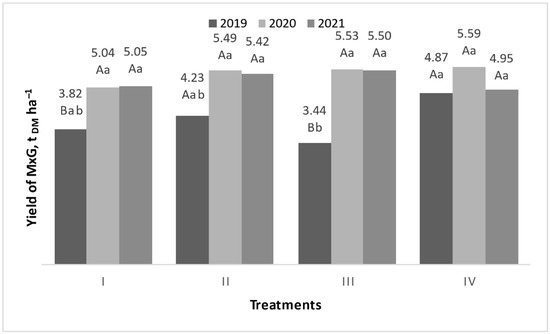 Yield of MxG (tDM ha−1) across treatments and study years. Means sharing the same capital letter (across years) or lowercase letter (across treatments) are not significantly different (Fisher’s test, p < 0.05). Abbreviations: I—control; II—sludge; III—mycorrhiza; IV—MxG ash.