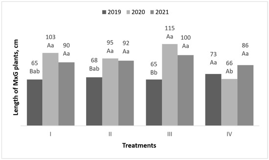 Length of MxG plants (cm) across treatments and study years. Means sharing the same capital letter (across years) or lowercase letter (across treatments) are not significantly different (Fisher’s test, p < 0.05). Abbreviations: I—control; II—sludge; III—mycorrhiza; IV—MxG ash.