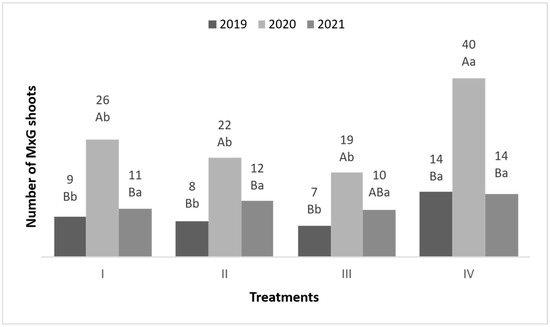 Number of MxG shoots across treatments and study years. Means sharing the same capital letter (across years) or lowercase letter (across treatments) are not significantly different (Fisher’s test, p < 0.05). Abbreviations: I—control; II—sludge; III—mycorrhiza; IV—MxG ash.