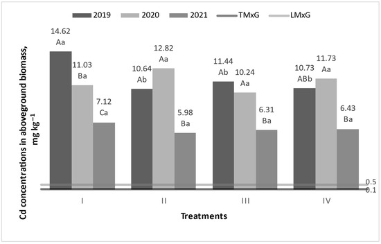 Cd concentrations in aboveground biomass (mg kg−1) across treatments and study years. Means sharing the same capital letter (across years) or lowercase letter (across treatments) are not significantly different (Fisher’s test, p < 0.05). Abbreviations: I—control; II—sludge; III—mycorrhiza; IV—MxG ash. TMxG—Typical value of Cd for combustion of MxG in solid biofuel production; LMxG—Limit value for content of Cd in pellets.