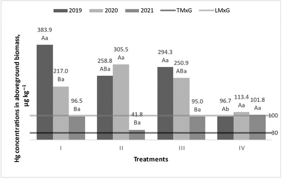 Hg concentrations in aboveground biomass (μg kg−1) across treatments and study years. Means sharing the same capital letter (across years) or lowercase letter (across treatments) are not significantly different (Fisher’s test, p < 0.05). Abbreviations: I—control; II—sludge; III—mycorrhiza; IV—MxG ash. TMxG—Typical value of Hg for combustion of MxG in solid biofuel production; LMxG—Limit value for content of Hg in pellets.