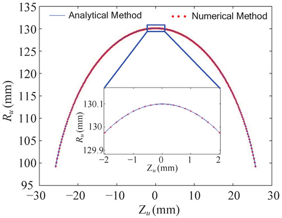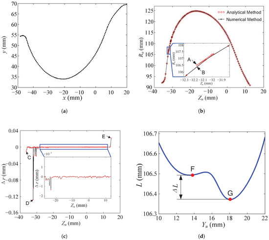 Figure 9a, where the point intervals are equal. The analytical method and the proposed numerical method are used to calculate the cutter profile according to the tooth profile, respectively. For easy comparison, the