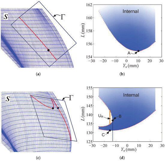 Figure 10a,b, the distance curve has a unique minimum point. The minimum value equals the radius of the cutter in this intersection plane. However, the intersection curve could be more complicated, as shown in