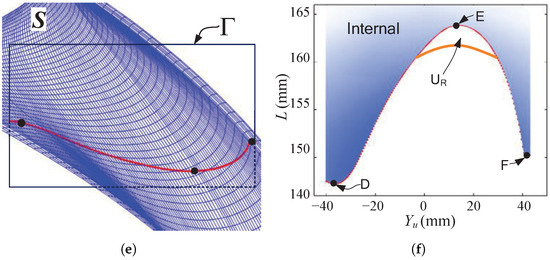 Figure 10e,f, which usually occurs when the radius of the cutter is larger than the minimum radius of the intersection curve. A global maximum point E exists on the distance curve, and the material near this region,