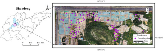The study area is located in Lixia District, Jinan City, Shandong Province, China, with center coordinates of 117°09′ E and 36°41′ N (Figure 1). The landform type is characterized as a hilly area, with the southern part being a low hilly region and the northern part a sloping plain. The average annual temperature is 14.2 °C, and the annual precipitation is 703.43 mm. The site covers an area of 0.37 km2. Due to mountain quarrying in the area, stone pits have formed, and most of the covering layer has been manually removed. The regional surface was developed for the construction of houses and factories, and quarrying backfill was carried out. Waste oil residues were dumped in low-lying areas and stone pits, and oil sludge was distributed in localized areas. Due to frequent human activities, it is crucial to clarify the multi-scale spatial heterogeneity of soil heavy metals at the refinery site.