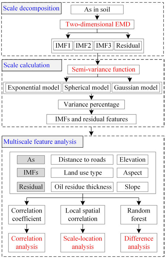 As shown in Figure 2, the technical route was mainly divided into three parts based on scale decomposition, scale calculation, and multi-scale feature analysis. For the scale decomposition part, the two-dimensional EMD method was used to obtain the intrinsic mode functions (IMFs) and residual components representing the spatial variation characteristics of As at a refinery site across different scales. For the scale calculation part, based on the semi-variance function model, the different components from the scale decomposition were fitted to obtain the variation range of heavy metal As at different scales, and the variance percentages at different scales were calculated to determine the main variation scale. For the multi-scale feature analysis part, the main environmental variables affecting As contents were identified by performing correlation analysis, scale–location analysis and difference analysis between As concentrations, the IMFs, the residual component, and the different environmental variables.