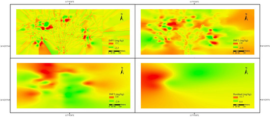 Based on two-dimensional EMD, soil heavy metal As was decomposed into intrinsic mode functions (IMF1, IMF2, IMF3) and a residual component (Figure 4). The spatial distribution of heavy metal As varied significantly across different scales. The variated range of IMF1 was between −2.2 and 2.1 mg/kg, with high and low values distributed in spots. The IMF2 ranged from −2.5 to 2.8 mg/kg, with high values distributed in the built-up areas of the study site. The IMF3 ranged from −2.9 to 3.0 mg/kg, with high values in the northeast building areas and low values in the central and southern wooded areas. The residual ranged from 8.4 to 11.7 mg/kg, reflecting the overall trend of heavy metal As variation. The spatial variation of As changed with scale: IMF1 and IMF2 exhibited fragmented distributions and pronounced local variations, whereas IMF3 and the residual showed continuous distributions. The original scale of As spatial distribution was most similar to IMF3, indicating that dominant variation occurred at this scale.
