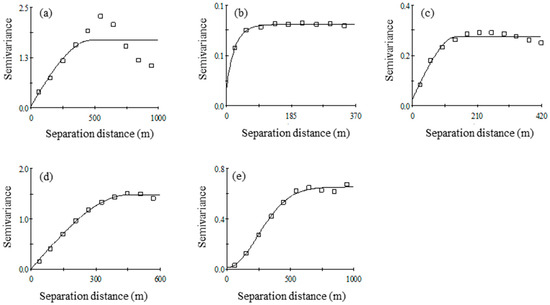 The semi-variance function model was an effective tool for evaluating spatial variability [34,35,36], which was expressed by the average variance between each pair of points, separated by vector h. The semi-variance is calculated by
