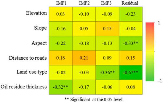 After scale decomposition using two-dimensional EMD, correlations between IMF1, IMF2, IMF3, residual, and environmental variables were determined, as shown in Figure 6. The correlations between small-scale IMF1, medium-scale IMF2, large-scale IMF3, the residual, and environmental variables were not consistent with the correlations between the original As and environmental variables (Table 2, Figure 6). Specifically, aspect was significantly correlated with As at the residual scale, but no significant correlations were achieved at other scales. Land use type showed a significant correlation at the large-scale IMF3 and the residual, with a particularly strong correlation with the residual, indicating that land use type mainly influenced the spatial variability of As at a large scale. The correlations between medium-scale IMF2 and environmental variables were not significant. After scale decomposition, oil residue thickness was significantly correlated with small-scale IMF1, while the influence of oil residue thickness on As was not identified at the original scale.