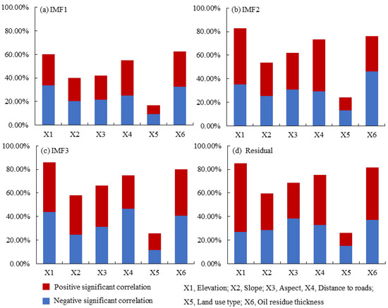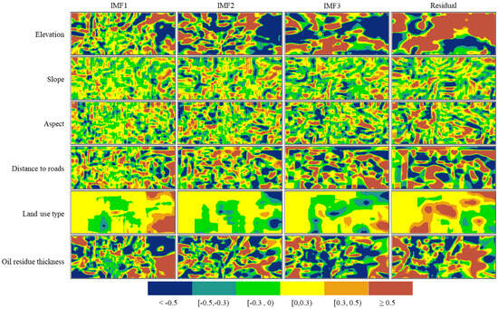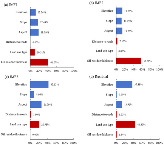 Figure 10 and Figure 11 show the differences in each environmental factor’s impact on As, IMFs/residual variability, respectively. The results indicated that the contribution of each factor ranged between 6.52% and 22.52% at the original scale, with land use type, aspect, and oil residue thickness having relatively greater influence. For small-scale IMF1 (Figure 11a) and medium-scale IMF2 (Figure 11b), oil residue thickness accounted for 41.07% and 57.69%, respectively, indicating that oil residue thickness was the dominant factor influencing As variability at small and medium scales. As scale increased, the contributions of elevation and aspect (natural factors), and land use type (anthropogenic factor) increased significantly. However, the influence of land use type on As variability was less than the combined effect of elevation and aspect, suggesting that elevation and aspect were the dominant factors influencing the spatial variability of As at large scale (IMF3). Residual-scale variability was primarily driven by the interaction of elevation, aspect, and land use type. In summary, the influence of environmental factors on As variability showed significant differences across different scales.
