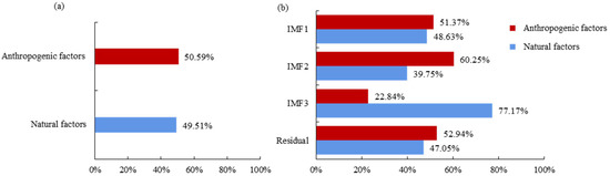 The differences in the impact of environmental variables on heavy metal As were reflected through the relative importance results of the random forest model. The random forest model revealed that the influence of natural factors and anthropogenic factors on As variability was relatively similar at the original scale, accounting for 49.51% and 50.49%, respectively (Figure 9a). These results indicated that both natural and anthropogenic factors jointly influenced the As variability at the original scale. At different scales, the influence of natural and anthropogenic factors on As variability showed differences. For small- and medium-scale components of As (IMF1, IMF2) and the residual, anthropogenic factors had larger proportions of influence. Conversely, for the large-scale component (IMF3), natural factors dominated (77.17% vs. 22.84%), as suggested in Figure 9b. At a medium scale (IMF2), anthropogenic factors accounted for 60.25%, which was a greater proportion of natural factors (39.75%). At a large scale (IMF3), natural factors comprised 77.17%, which was more than three times the proportion of anthropogenic factors (22.84%) (Figure 9b).