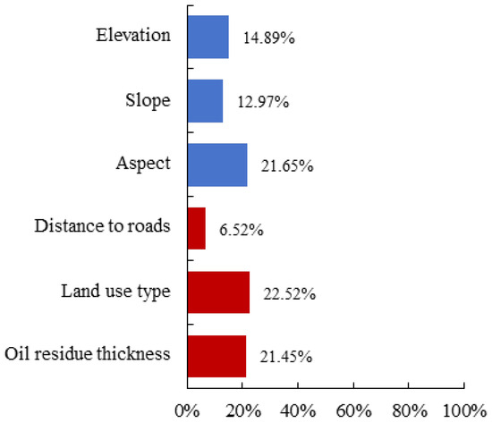 The spatial distribution and sources of heavy metals in soil are mainly influenced by both natural and anthropogenic factors [27]. Due to the limited area of the site, the soil type and climate of influencing factors remained essentially invariant in the study area and could not determine the extent of their influence on soil heavy metals. Based on site conditions, data acquisition challenges, soil heavy metal sources, and the influencing factor selection method established by Gong et al. [28], this study selected three natural factors (elevation, slope, and aspect) and three anthropogenic activity factors (land use type, distance to roads, and oil residue thickness) as potential environmental variables affecting As content in soil.