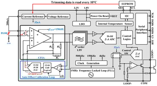 This paper presents a low-power, low-noise instrumentation amplifier for sensor-based temperature transmitter systems. The overall architecture of the transmitter is illustrated in Figure 1. The system primarily consists of a differential input; auto-offset-calibration-assisted current-feedback instrumentation amplifier (CFIA); a fourth-order low-pass filter (LPF); a buffer; and a 16-bit sigma-delta ADC. In addition, several auxiliary modules are integrated on chip, including an on-chip temperature sensor, a high-precision current source circuit with multipoint trimming, a reference circuit, a low-dropout (LDO) linear regulator, a frequency-locked loop (FLL), a chopper clock generator, and a serial peripheral interface (SPI).