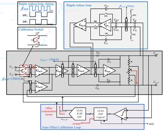 - Kusuda, Y. Auto Correction Feedback for Ripple Suppression in a Chopper Amplifier. IEEE J. Solid-State Circuits 2010, 45, 1436–1445. [Google Scholar] [CrossRef]