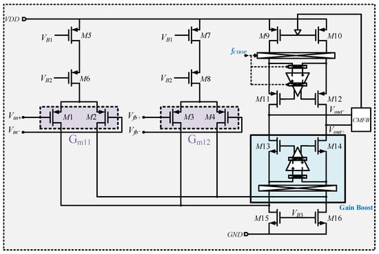 As illustrated in Figure 4, the front-end input transconductance amplifier adopts a folded cascode topology consisting of three main parts: Gm11, Gm12, and Gm2. This structure employs chopper modulation and gain-boosted transconductance stages, effectively suppressing both offset and noise while performing signal acquisition and primary amplification for sensor interfaces.
