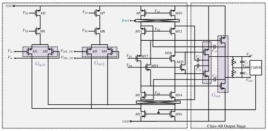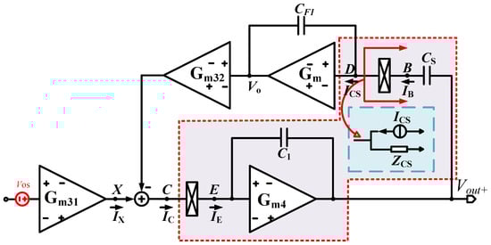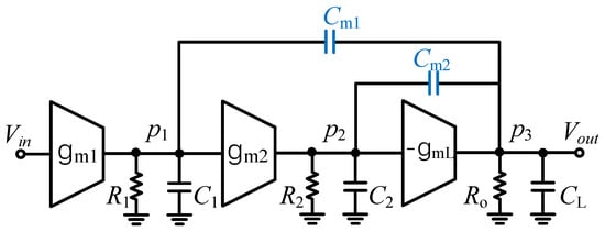 Since the CFIA amplifier presented in this work adopts a three-stage cascaded architecture, a nested Miller compensation (NMC) scheme [24] is introduced between Gm31, Gm32, and the output stage Gm4 to ensure the overall stability of the multistage amplification chain. As shown in Figure 6, this compensation technique employs feedback capacitors Cm1 and Cm2 between different gain stages to achieve pole splitting, thereby effectively suppressing system instability while preserving the high gain advantage provided by the multistage amplifier structure.