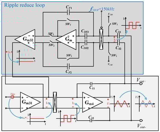 As shown in Figure 8, a simplified schematic of the ripple reduction loop (RRL) is presented. Assuming that nodes D and E are virtual grounds, the following current relationships can be derived: