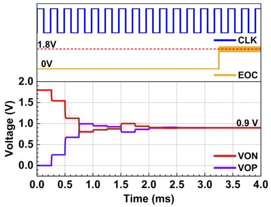 Figure 10 presents the calibration process of the automatic offset calibration loop (AOCL). The yellow, blue, green, and purple waveforms represent the 4 kHz AOCL clock, AOCL end-of-conversion (EOC) signal, the positive output (VOUT+) of the CFIA, and the negative output (VOUT−), respectively. When a differential offset of 100 mV is applied to the input (as shown in Figure 3), the AOCL operation calibrates the output offset to approximately 1 LSB. The calibration time of the AOCL is 3 ms.