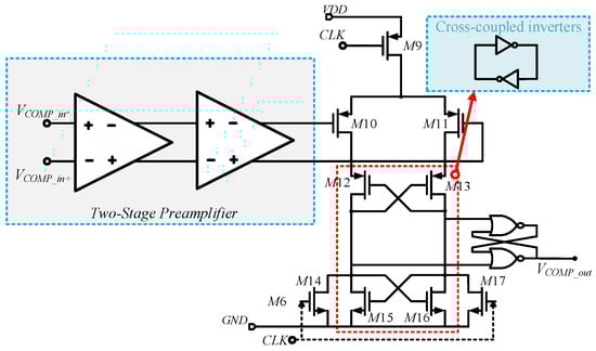 The comparator in the AOCL (as shown in Figure 12) consists of two preamplifier stages for offset voltage reduction, followed by a positive feedback latch stage. The latch stage is reset when the CLK signal is high; when CLK transitions from high to low, the comparator operates. The differential outputs of the latch stage, Vout+ and Vout−, are stored by an SR latch to generate VCOMP_OUT. The operating frequency of the comparator is 4 kHz. Since the comparator senses the common-mode level at the CFIA output, the input-referred noise at this node is attenuated by the gain of the CFIA.