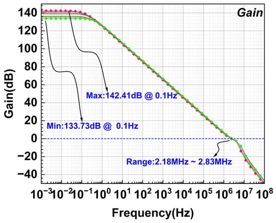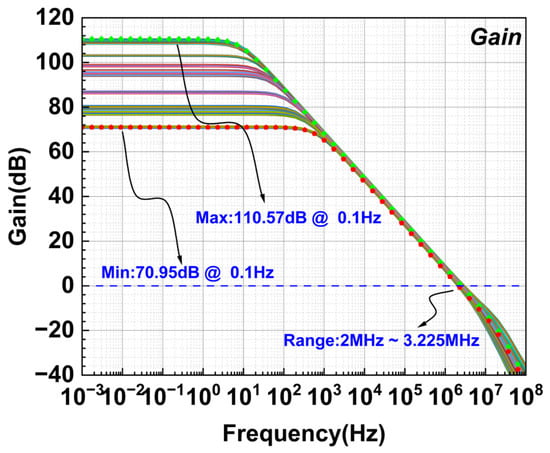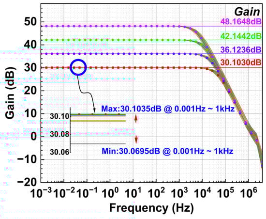 Figure 14 shows the chip micrograph of the proposed 4–20 mA transmitter system. The circuit is implemented in a 0.18 μm 1P4M BCD process, and the transmitter chip size is 2.8 mm × 2.1 mm. The complete system operates over a supply voltage range of 5–36 V, while the proposed CFIA is powered by a 1.8 V LDO, consuming 182 μA. Figure 15 and Figure 16 and Figure 17 and Figure 18 show the magnitude and phase responses of the input-stage and intermediate transconductance amplifiers, respectively. The chopper frequency is set to 150 kHz. The DC gain of the CFIA is programable via a 2-bit decoder, with a gain range covering 30.10 dB to 48.16 dB, as illustrated in Figure 19. The gain-bandwidth product is 2.16 MHz. Figure 20 presents the post-layout simulated results for four gain settings, showing the CFIA amplifying an input signal of 1 mV amplitude, 0.9 V common-mode voltage, and 4 kHz frequency.