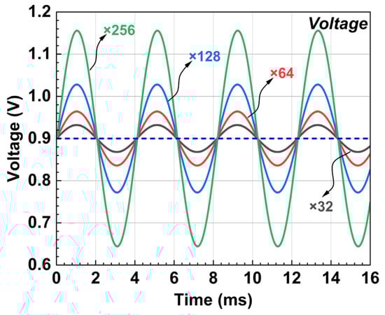 To improve both calibration accuracy and hardware efficiency, the DAC in this work (as shown in Figure 11) adopts a hybrid architecture combining thermometer code and an R-2R structure. Specifically, the most significant bits (MSB, upper 4 bits) employ thermometer decoding for coarse adjustment, while the least significant bits (LSB, lower 8 bits) use a conventional R-2R ladder for fine adjustment. The output voltage of the DAC can be expressed as: