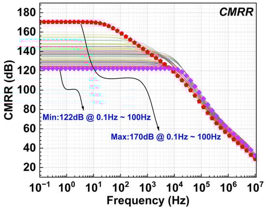 Figure 21 shows the equivalent input-referred noise of the CFIA across all process corners. At 1 kHz, the best input-referred noise is 13.79 nV/√Hz and the worst is 20.28 nV/√Hz. Figure 22 and Figure 23 present the simulated common-mode rejection ratio (CMRR) and power supply rejection ratio (PSRR) across all process corners. The CMRR of the CFIA ranges from a best case of 170 dB to a worst case of 122 dB, while the PSRR ranges from 136 dB to 117 dB. Figure 24 shows the Monte Carlo simulation results for the input offset voltage of the CFIA, with all simulations covering all process corners and extreme values of temperature and supply voltage.