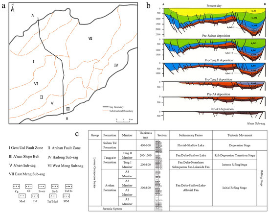 (a) Tectonic division map of the A’nan Sag, modified from Zhang et al. (2025) [44]; (b) Schematic geological sections across the A’nan Sag, refers to Sun et al. (2017) [45]; (c) generalized stratigraphic column of the A’nan Sag, modified from Sun et al. (2001) [46].