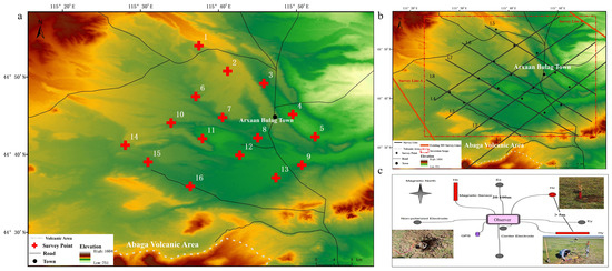 (a) Distribution of magnetotelluric stations in the study area; (b) layout of magnetotelluric survey lines in the study area; (c) schematic diagram of phoenix geophysics MTU-5A system deployment.