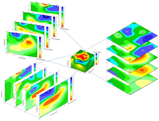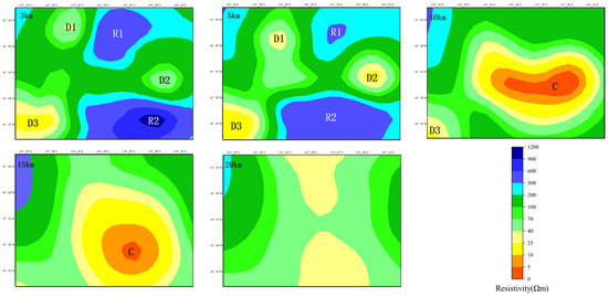 Based on the high-precision resistivity model obtained from 3D inversion, this study systematically reveals the electrical structure controlling thermal anomalies in the southwestern A’nan Sag by extracting horizontal slices at depths of 3 km, 5 km, 10 km, 15 km, and 20 km, combined with eight intersecting profiles (four NNE-striking lines L1–L4 and four NW-striking lines L5–L8) covering the core thermal anomaly zone (Figure 4). As illustrated in Figure 5, the horizontal slice analysis demonstrates significant vertical heterogeneity: (1) Shallow depths (3–5 km): Three low-resistivity zones (D1, D2, D3) exhibit spatial segregation from high-resistivity areas, with D1 and D2 showing progressively decreasing resistivity values and laterally expanding coverage with in-creasing depth, ultimately forming a vertical interconnection with the ultra-low-resistivity Anomaly C (0–5 Ωm) at 10 km depth. (2) Mid-depth (10 km): Anomaly C attains its maximum spatial extent, while a regionally extensive moderate-low resistivity background (10–40 Ωm) dominates the area. (3) Deep levels (15–20 km): Anomaly C diminishes in scale, and the regional moderate-low resistivity back-ground expands laterally at 15 km depth but contracts vertically from 15–20 km, ac-companied by a significant reduction or attenuation of the shallow high-resistivity background (>200 Ωm), likely associated with enhanced deep-seated partial melting processes.