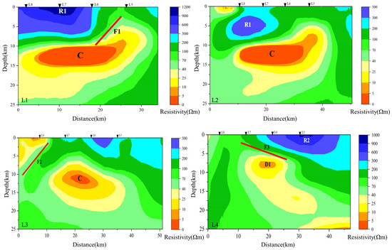 Cross sections along survey lines L1–L4 of the 3D inversion model in the study area.