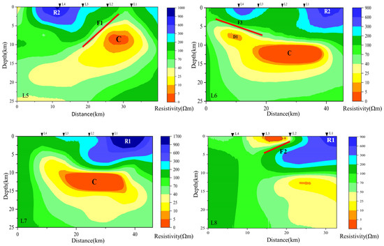 The NW-striking profiles (L5–L8) demonstrate NNE-striking continuity of Anomaly C, with its spatial extent and geometry consistent with NNE-oriented profiles (L6 aligns with L1/L2), and reveal a shallow low-resistivity body D1 with L6 correlating with L4 in delineating this feature. Profile L8 displays a moderate-low resistivity zone (10–50 Ωm; Figure 7) but lacks a distinct deep Anomaly C (0–5 Ωm). All profiles resolve shallow high-resistivity domains (R1/R2), with partial sections revealing thermally conductive faults (F1, F2, F3). This electrical structure provides critical constraints for delineating shallow geothermal reservoir boundaries, characterizing deep-seated heat-conducting pathways, and clarifying the thermo-tectonic framework.
